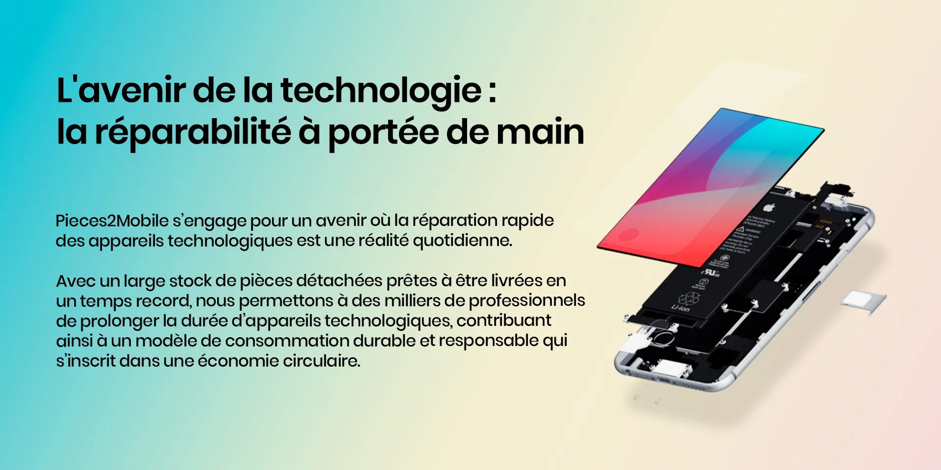 Grossiste en pièces détachées de téléphones, Pieces2Mobile est un acteur majeur du secteur de la réparation des smartphones et tablettes. En fournissant les professionnels de la réparation en pièces de rechange, Pieces2Mobile permet chaque année à des milliers de dispositifs électroniques d’être réparés, reconditionnés ou recyclés. Cela a pour conséquence de limiter la consommation et le gaspillage des ressources ainsi que la production de déchets.